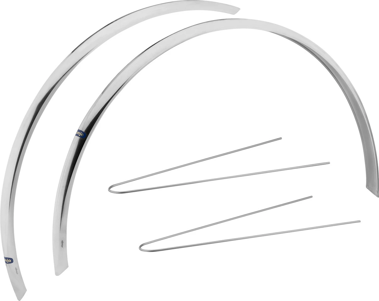 Das H27 Schutzblech Set von Honjo gehört zu den legendären auf Hochglanz polierten Klassikern aus Japan. Die Schutzbleche decken eine Reifenbreite von bis zu 25 mm ab. Mit dem besonders weit umfassenden Profil wird Spritzwasser einwandfrei im Blech gefangen gehalten. Das heißt, auch Füße und Kurbel bleiben trocken. Zudem verfügen die handgearbeiteten Schutzbleche von Honjo über eine edle Optik, ein geringes Gewicht und eine ausgesprochen lange Haltbarkeit. Das H27 gibt es auch als „hammered“ Version, bei Fans von klassischen Rädern eine besonders beliebte Optik.