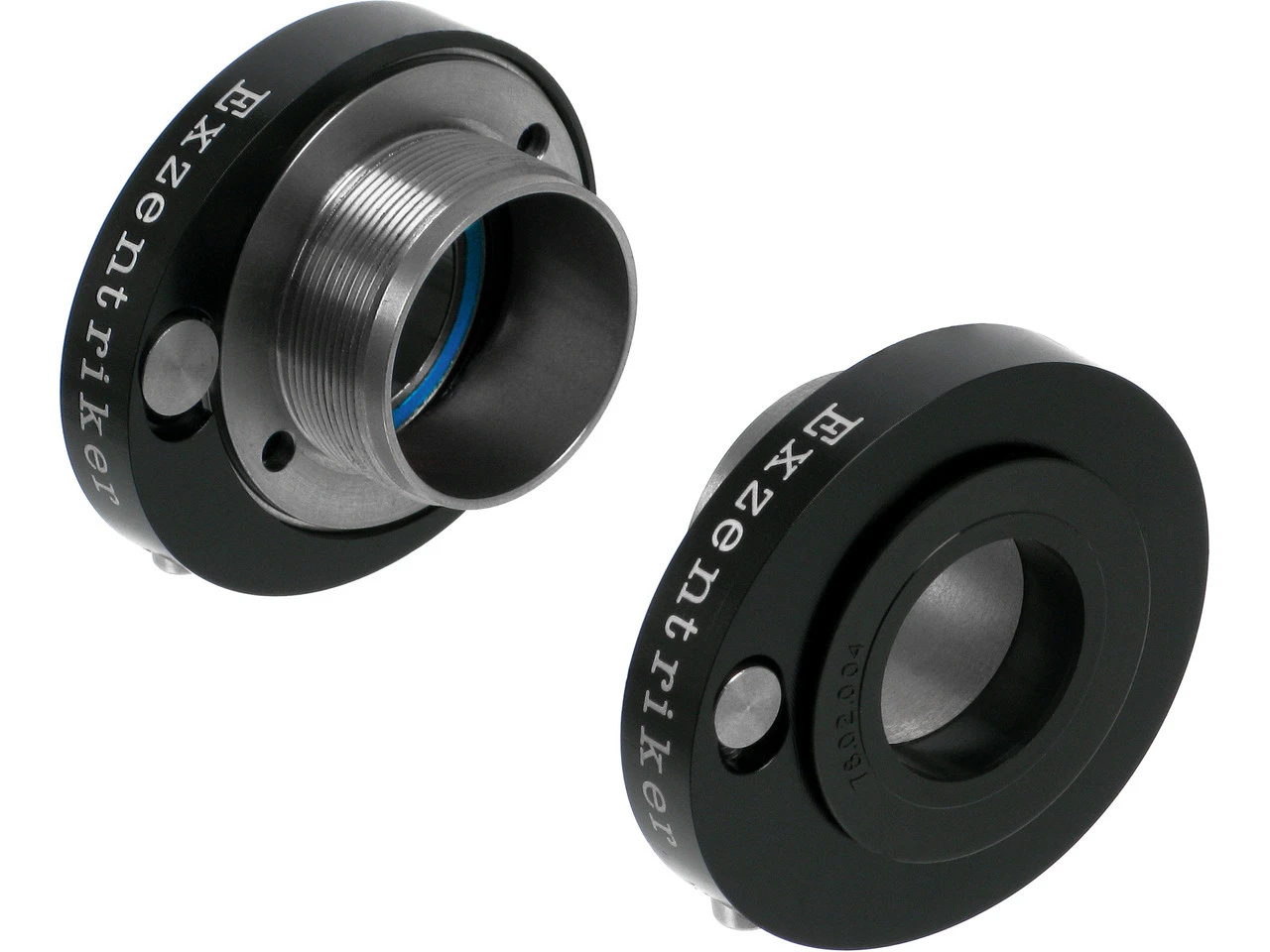Trickstuff wäre nicht Trickstuff ohne solche Sahneteile wie den Exzentriker. Das ist das erste und weltweit einzige Exzentertretlager, das in ganz normale BSA-Tretlagergehäuse montiert werden kann und jede herkömmliche 24-mm-Tretlagerwelle (z. B. Shimano Hollowtech II und viele andere) aufnimmt. Es dient zur stufenlosen Einstellung der Kettenspannung bei Singlespeedern oder Nabenschaltungsbikes (z. B. Rohloff) und macht Kettenspanner oder verstellbare Ausfallenden überflüssig. Der Exzentriker bettet die Tretlagerwelle in zwei himmlisch weich drehenden Spezial-Kugellagern, die sich gegenüber herkömmlichen Lagern durch ihre Rostfreiheit und ihr Spezialfett auszeichnen und ein nahezu unendlich langes Lagerleben bieten. Auch der Exzentriker ist patentrechtlich geschützt. Und, wie es sich gehört, brained and made im Schwarzwald!